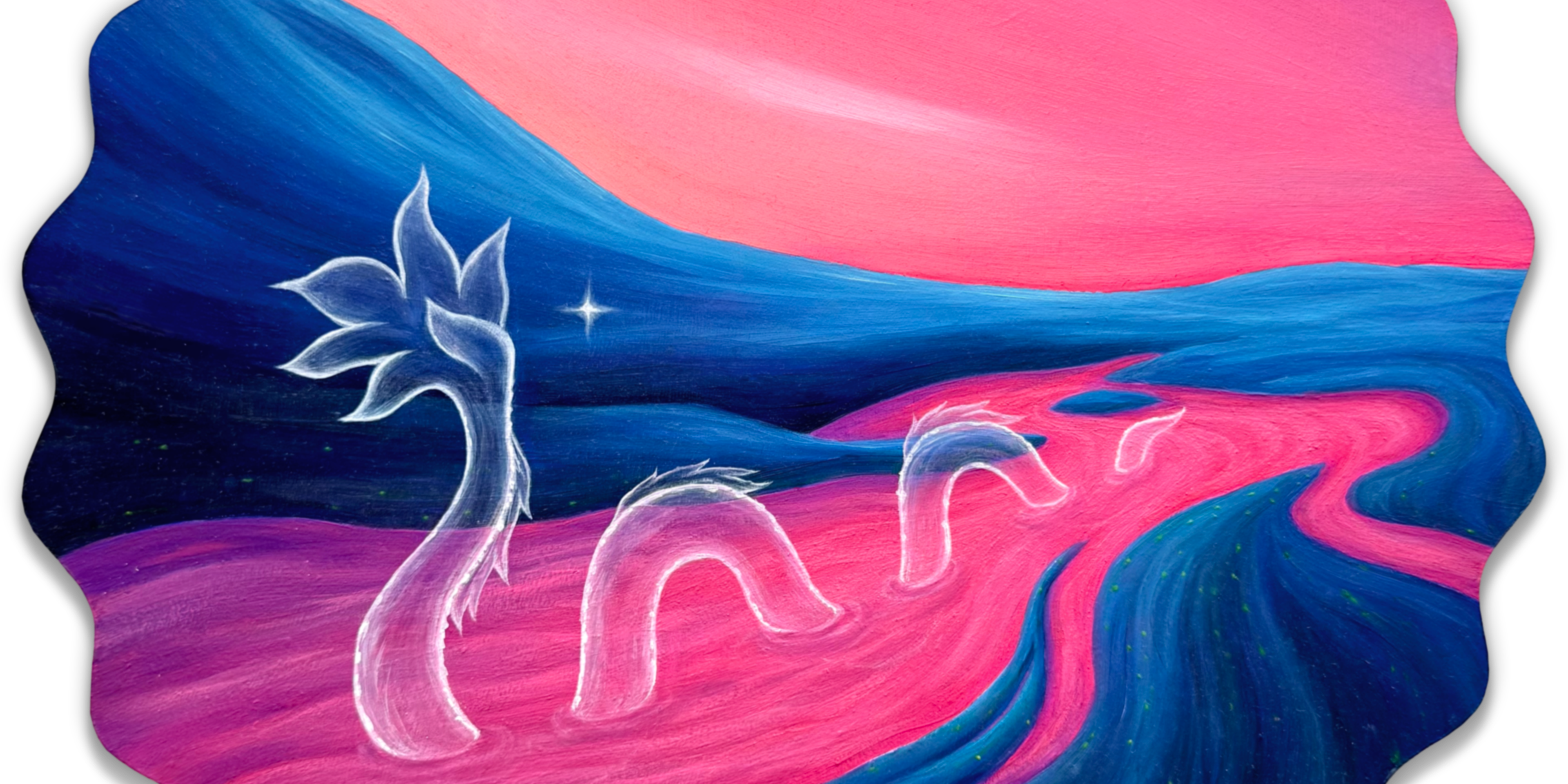 This series of works immerses us in a new journey through the worlds of the subconscious. Here we encounter the shadow sides of our personality. Internal monsters that we do not always want to see and recognize.The paintings depict energy beings, the prototypes of which were famous mythical monsters that had insane destructive power. Similarly, living in inner worlds, such beings can harm the soul. In myths, there has always been a hero who defeated the monster. And in our soul there is no other hero except ourselves. Therefore, we must find and overcome our monsters, and some may even be tamed. There is no need to be afraid of monsters. A strong personality can withstand everything that exists in its soul. Only in this way can one know oneself.